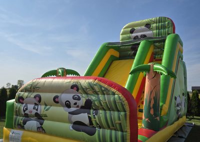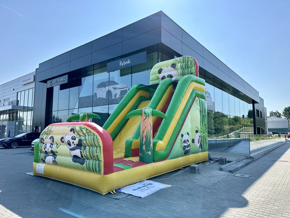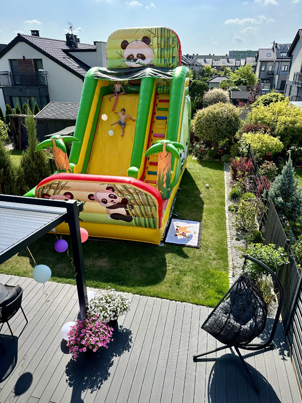 Został zaprojektowany z motywem uroczej pandy, otoczonej palmami, a całość utrzymana jest w żywych kolorach: żółtym, zielonym i czerwonym, które przyciągają uwagę i tworzą wyjątkową atmosferę zabawy. To idealne miejsce do skakania, wspinania się i bezpiecznego szaleństwa na świeżym powietrzu.