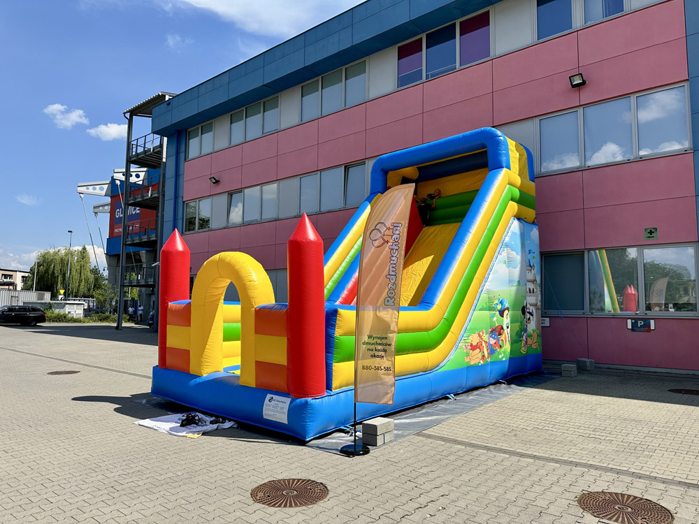 Zamek jest pełen kolorów – dominują w nim odcienie niebieskiego, żółtego, czerwonego i zielonego, co sprawia, że jest niesamowicie widoczny i przyciąga wzrok. Dodatkowo, jego design nawiązuje do bajkowej estetyki rodem z Disneya, co jeszcze bardziej pobudza wyobraźnię dzieci i zapewnia im mnóstwo niezapomnianej zabawy.
