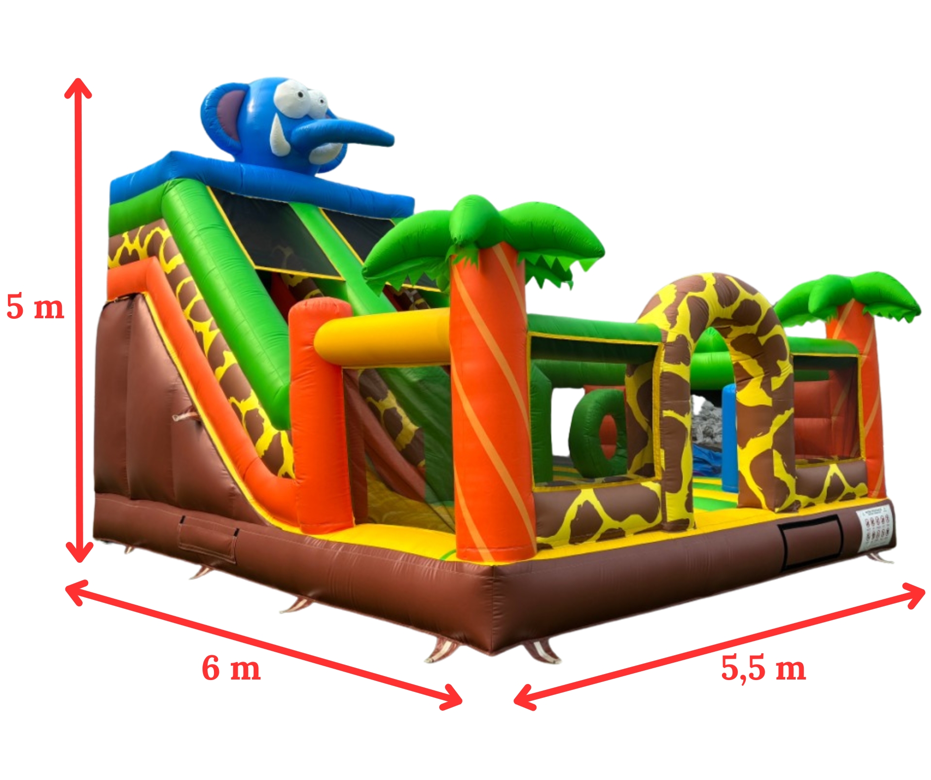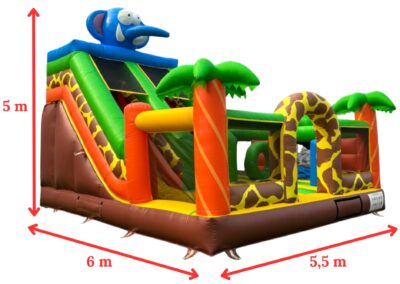 - Wymiary atrakcji po rozłożeniu: 6 m x 5,5 m x 5,2 m ( długość x szerokość x wysokość )